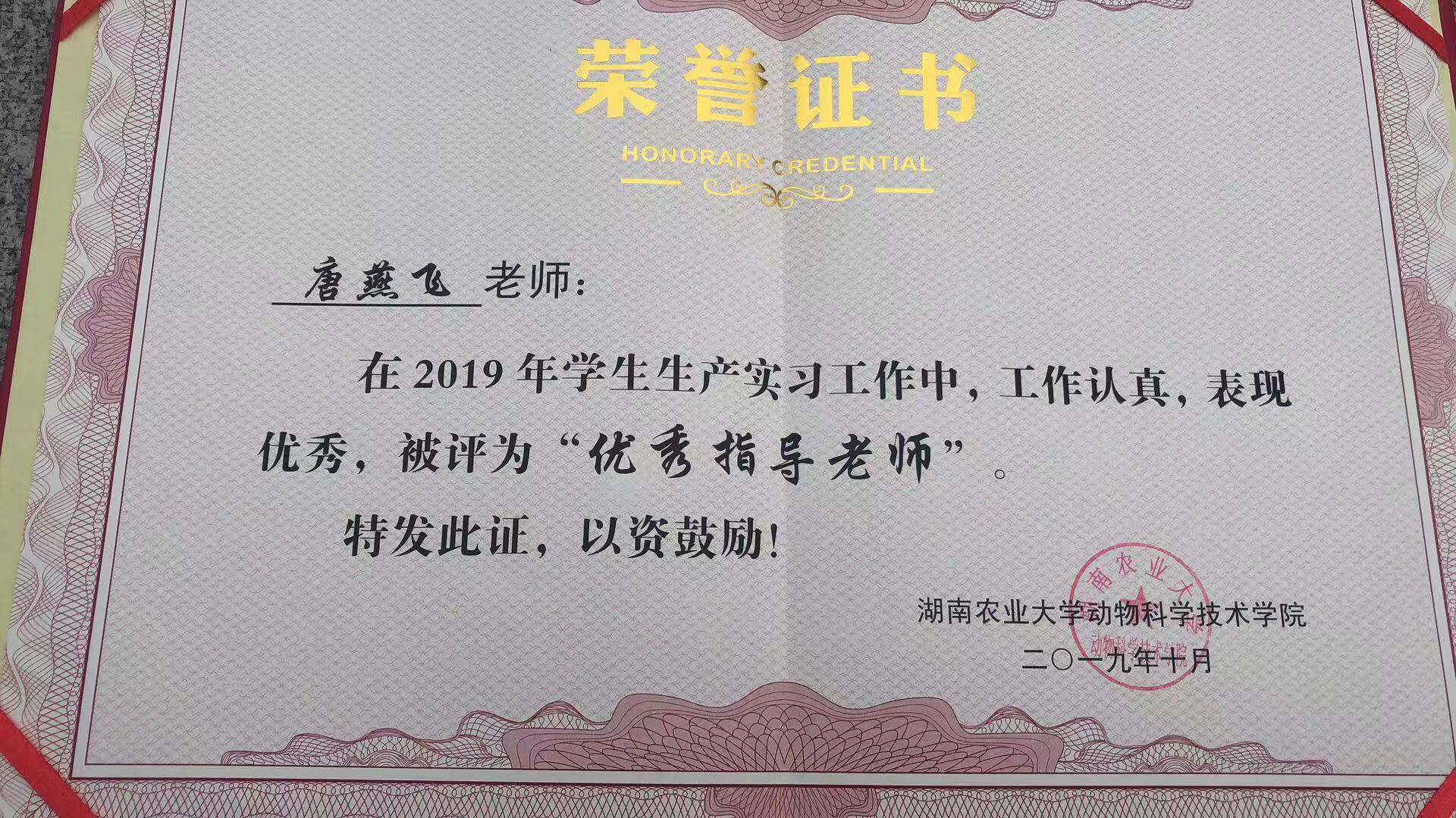 唐燕飞老师被评为“优秀指导老师”称号