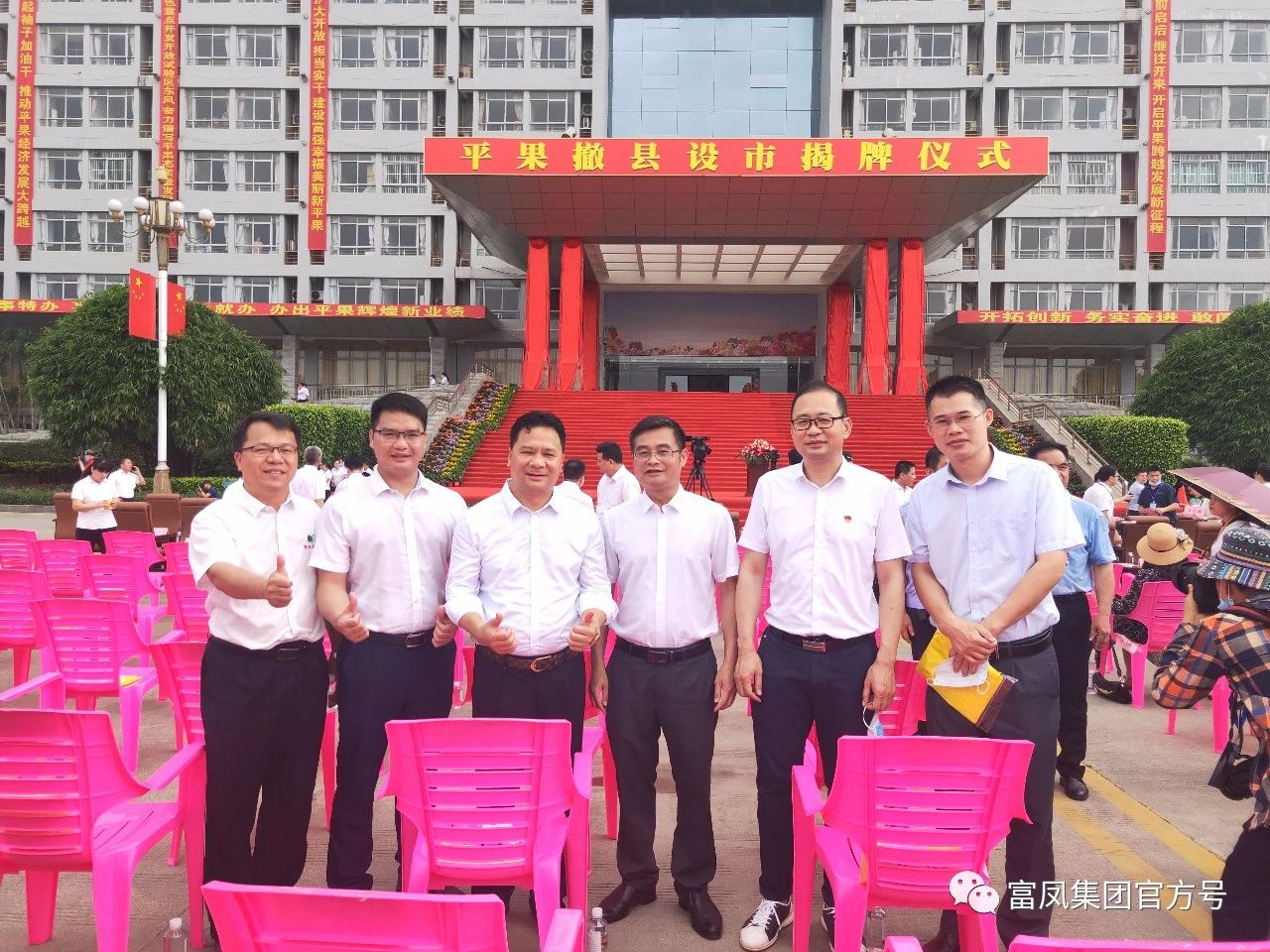 【概要描述】5月18日,广西平果撤县设市揭牌仪式在平果市行政信息中心大楼隆重举行。成人看片APP集团李非董事长、韦宗海常务副总作为市政府嘉宾应邀出席揭牌仪式,并代表成人看片APP集团广西富鹏农牧有限公司对平果撤县立市表示热烈祝贺!!