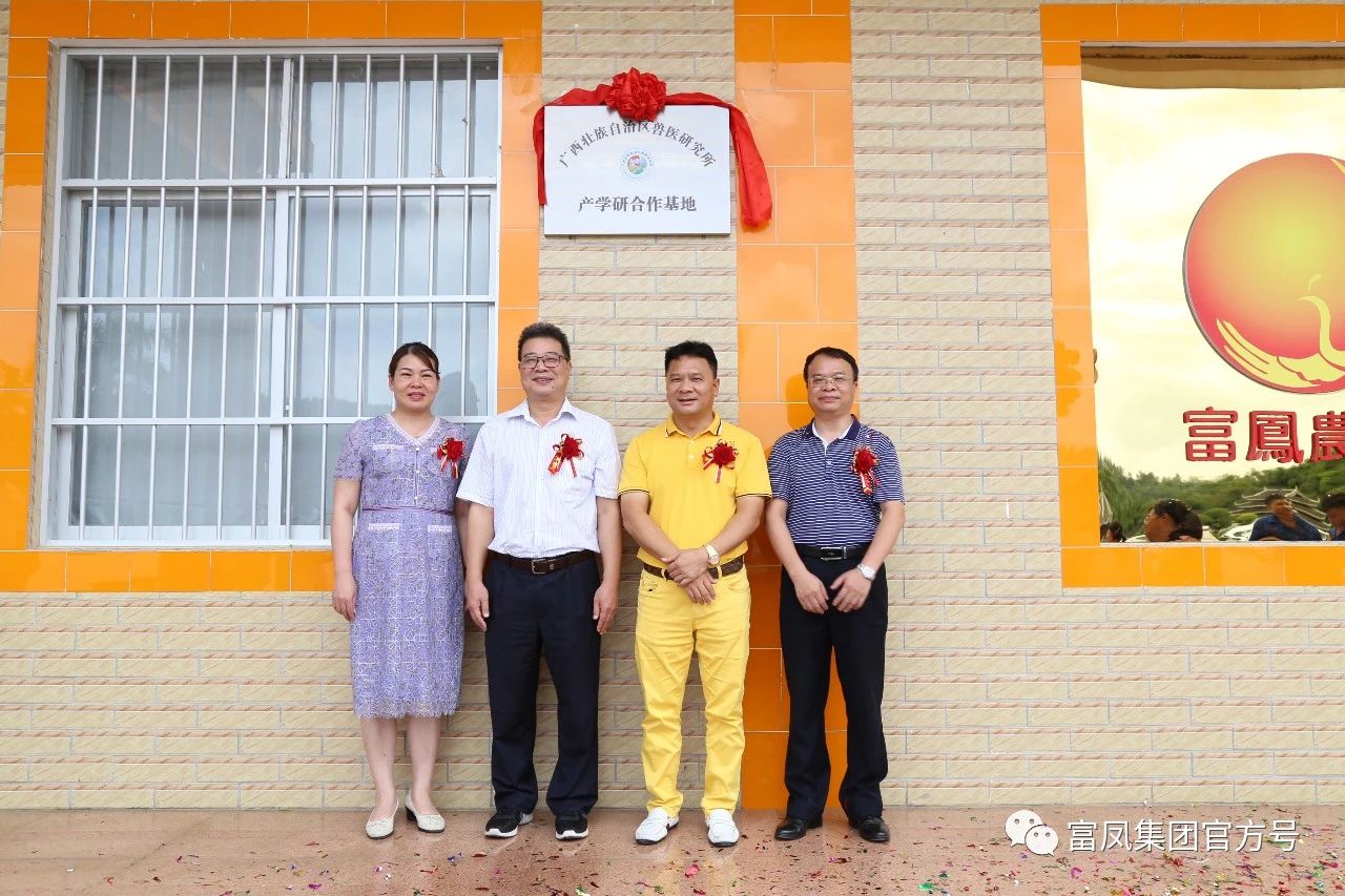 ▲广西兽医研究所所长陈忠伟、副所长廖玉英、自治区农业农村厅畜牧与成人手机看片你懂的处副处长卢玉发、成人看片APP集团李非董事长为合作基地揭牌。