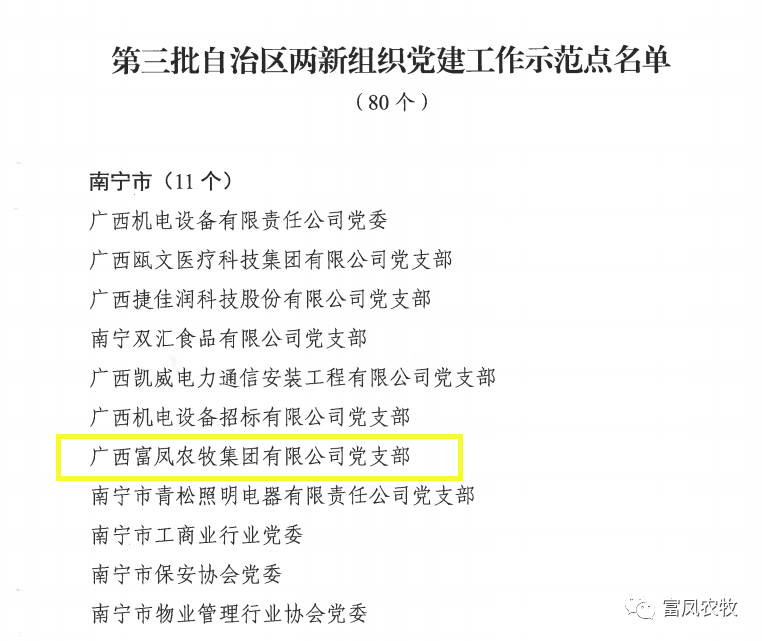 7月27日,中共广西壮族自治区委员会组织部、中共广西壮族自治区非公有制经济组织和社会组织工作委员会文件桂组通字202061号《关于公布第三批自治区两新组织党建工作示范点名单的通知》,广西成人看片APP农牧集团有限公司党支部确定为自治区两新组织党建工作示范点。