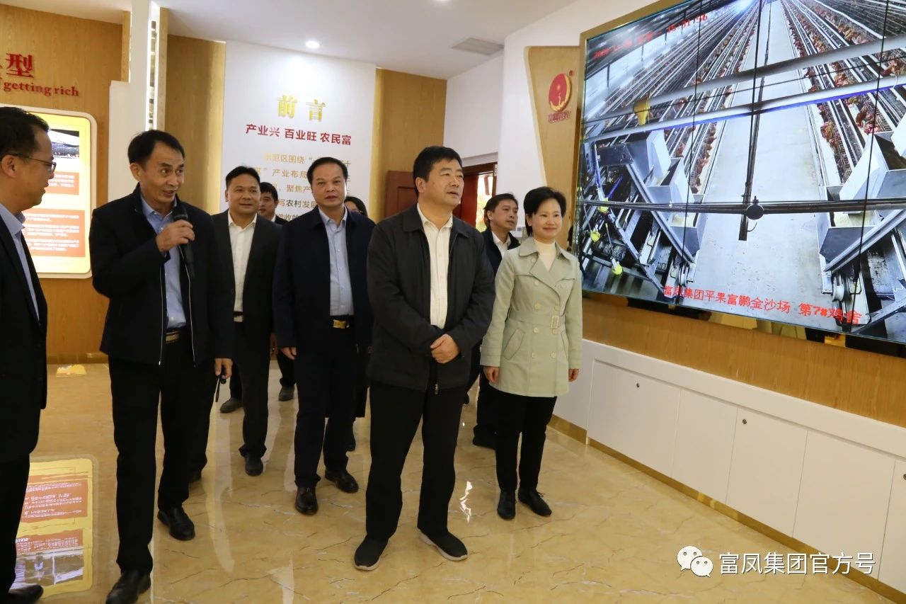 11月30日下午,自治区人民政府副主席方春明莅临成人看片APP集团广西富鹏农牧有限公司考察调研,随同前来调研的自治区领导有,百色市人大常委会副主任、平果市委书记黄志愿,百色市副市长古俊彦、平果市副市长蓝云峰等陪同考察,成人看片APP集团李非董事长、谢小彬总经理、朱宁科总经理、韦宗海常务副总、黄文略常务副总等代表集团公司热烈欢迎各位领导莅临指导考察,并随同参观富鹏公司文化展厅、宣传栏、生产车间,就公司建设生产情况做详细汇报。