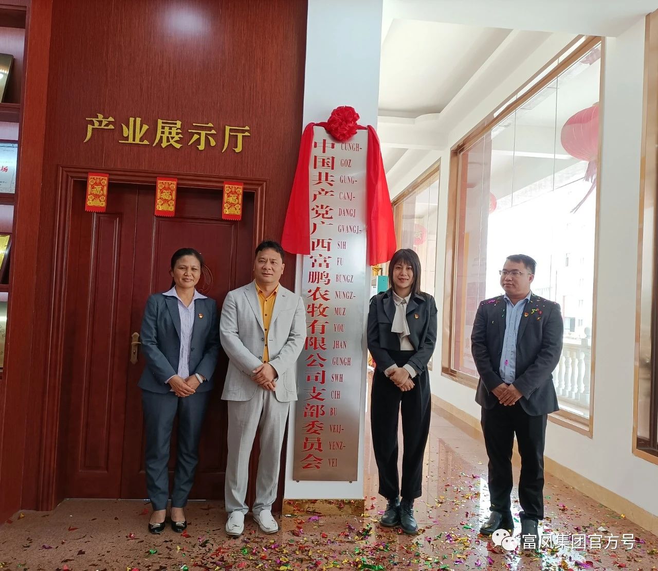 ▲ 平果市党员教育中心副主任、两新党工委办公室主任陆妍君 、李非董事长、陆海英总经理、阮俊杰组委为广西富鹏农牧有限公司党支部揭牌