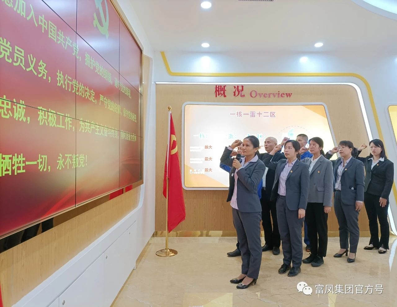 ▲广西富鹏农牧有限公司党支部在新当选支部书记陆海英的带领下面对党旗重温入党宣誓。