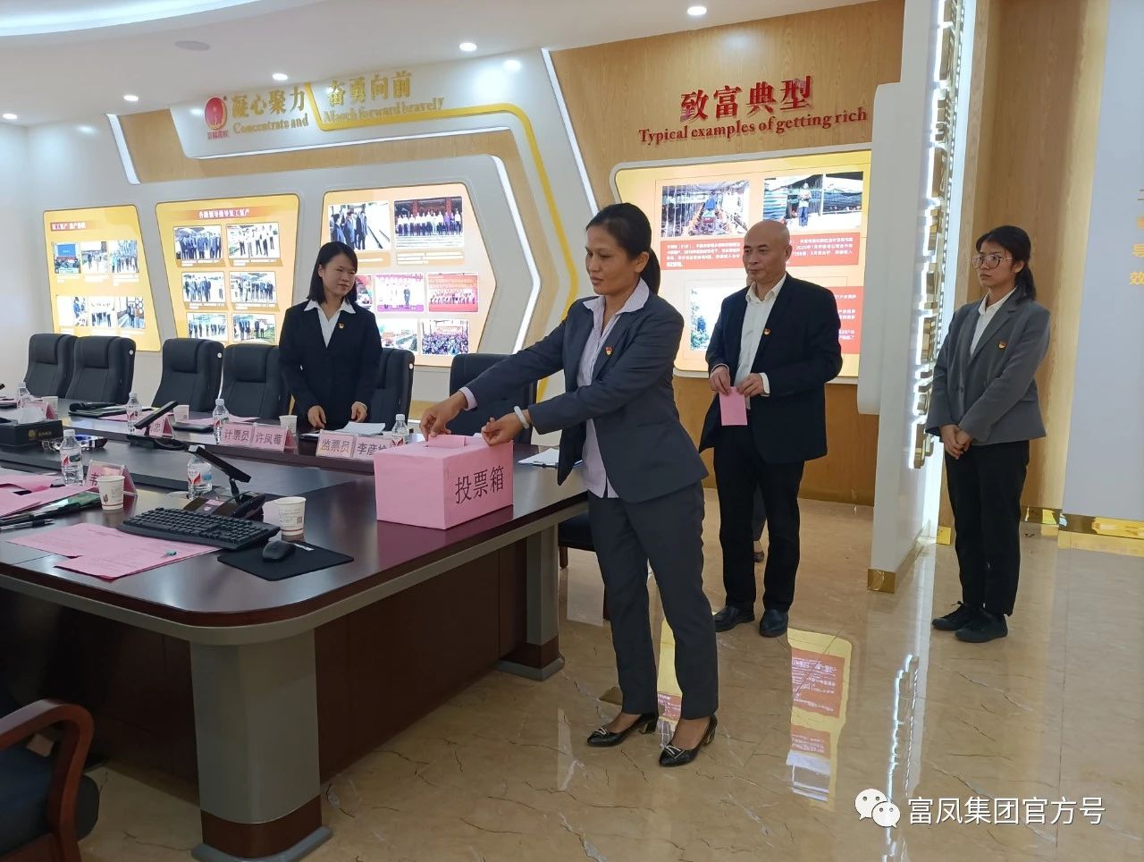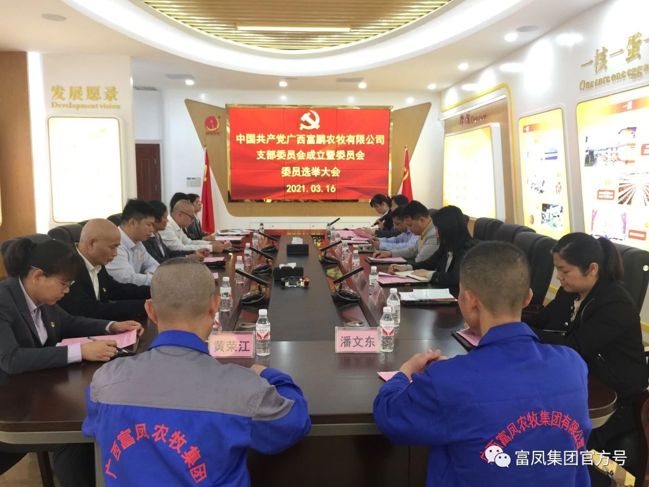 揭牌仪式后,广西富鹏农牧有限公司党支部召开第一次全体党员会议,通过无记名投票选举养殖事业部总经理陆海英为支部书记,项目部总监廖克颂为宣传委员,采购部许玉莲经理为组织委员。